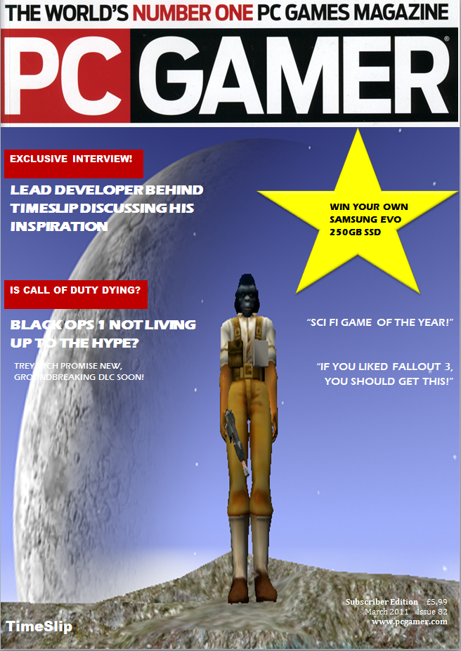 As such, I have made appropriate adjustments as you can see above. I have replaced the star with an actual image of the device that the audience could win, and changed the font and colour text slightly so that it stands out a little more from the rest of the page. I have also moved the title from the bottom left hand corner, to the top right and have massively increased the font size to make it more obvious, as well as colouring it in the typical Science Fiction colours. It should be noted however, that this goes against the typical PCGamer house style, as in the majority of the covers I looked at, the game's title was in the bottom left of the screen, as it was the image from the game that was used as the selling point of the cover, not the actual game itself.